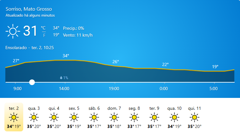 Condição atual: Ensolarado, com temperatura de 31°C. Previsão para o dia: Máxima: 35°C Mínima: 21°C Céu: Ensolarado. Nascer…