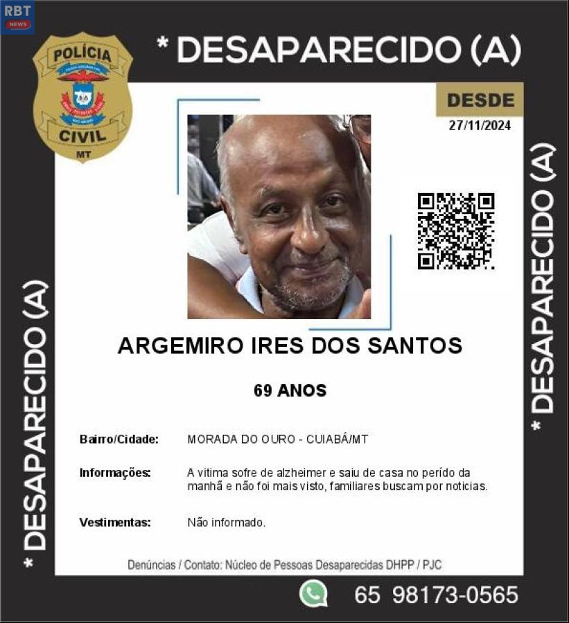 Idoso de 69 anos está desaparecido em Cuiabá; família pede ajuda para encontrá-lo Argemiro Ires…