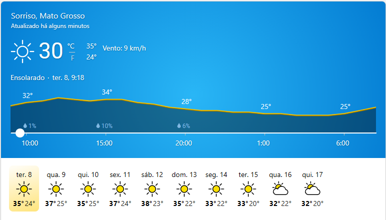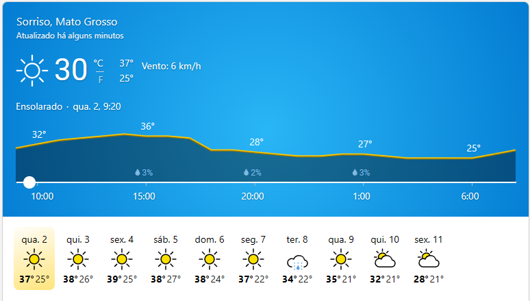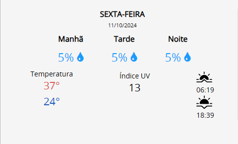 Condição Atual: Tempo: Ensolarado Temperatura Atual: 30°C Previsão para o Dia: Máxima: 37°C Mínima: 25°C Condição: Ensolarado Horários Importantes: Nascer…