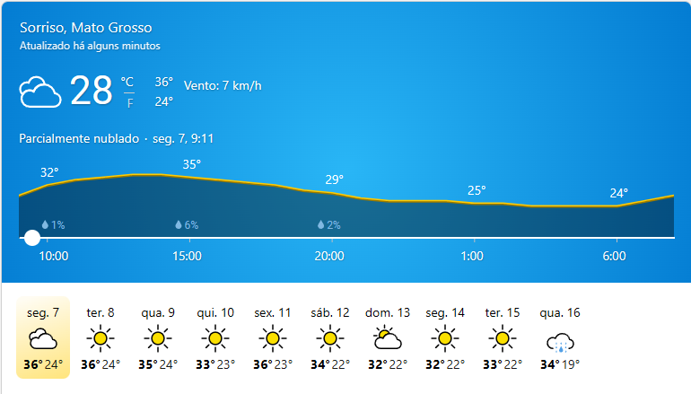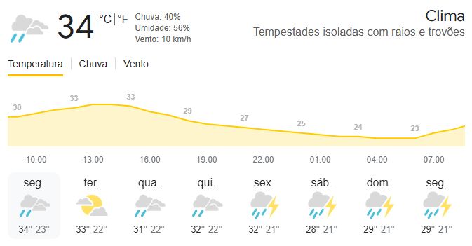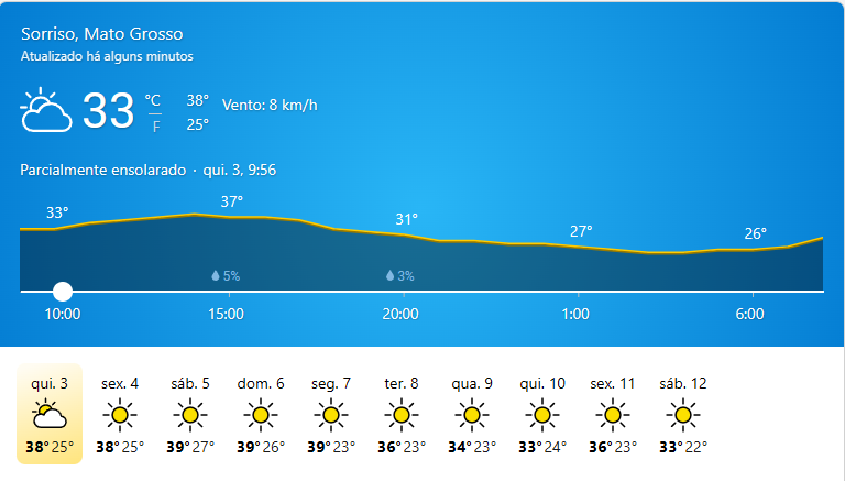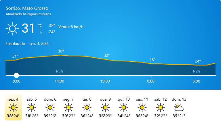 Condição do tempo: Ensolarado Temperatura atual: 31°C Temperatura máxima: 38°C Temperatura mínima: 24°C Chance de…
